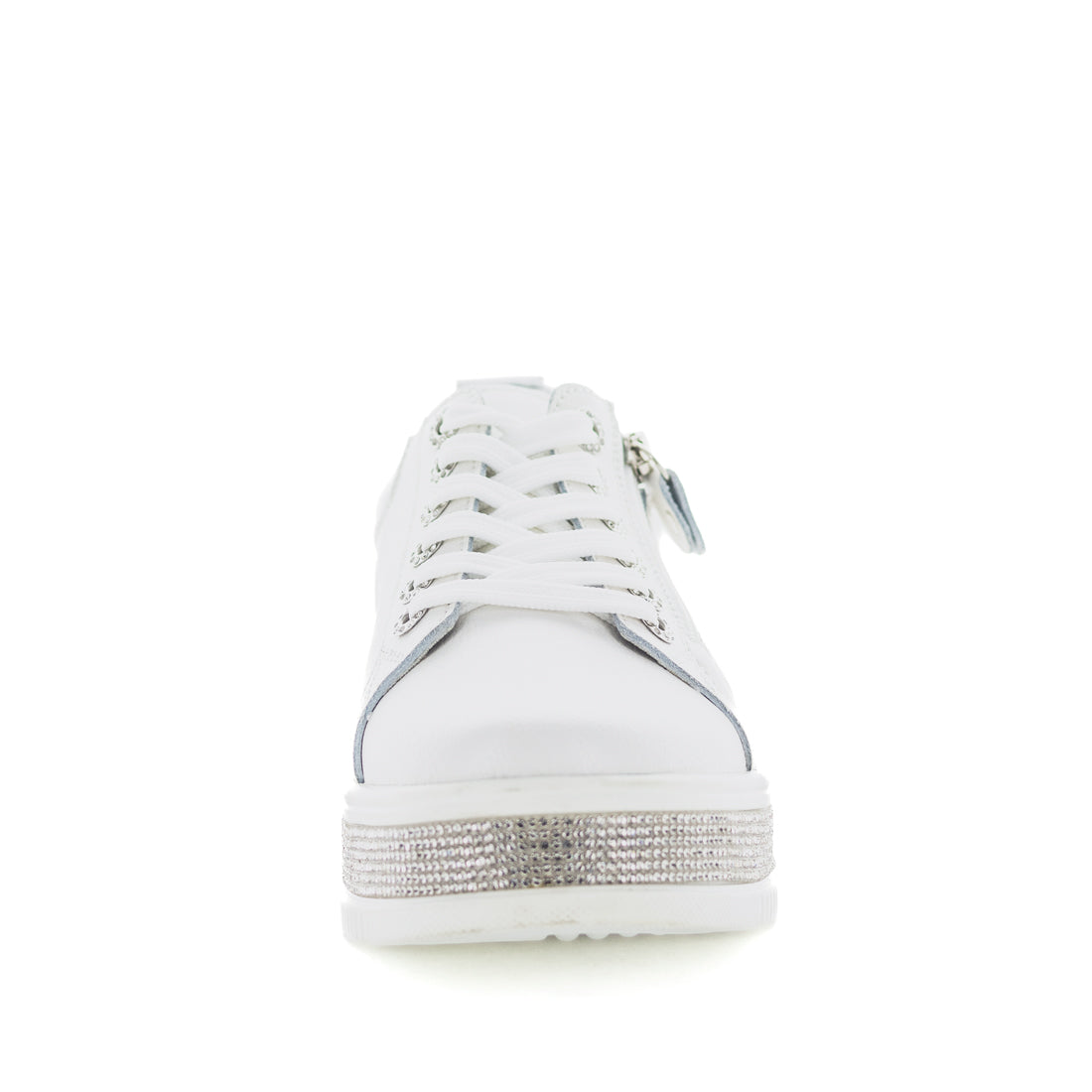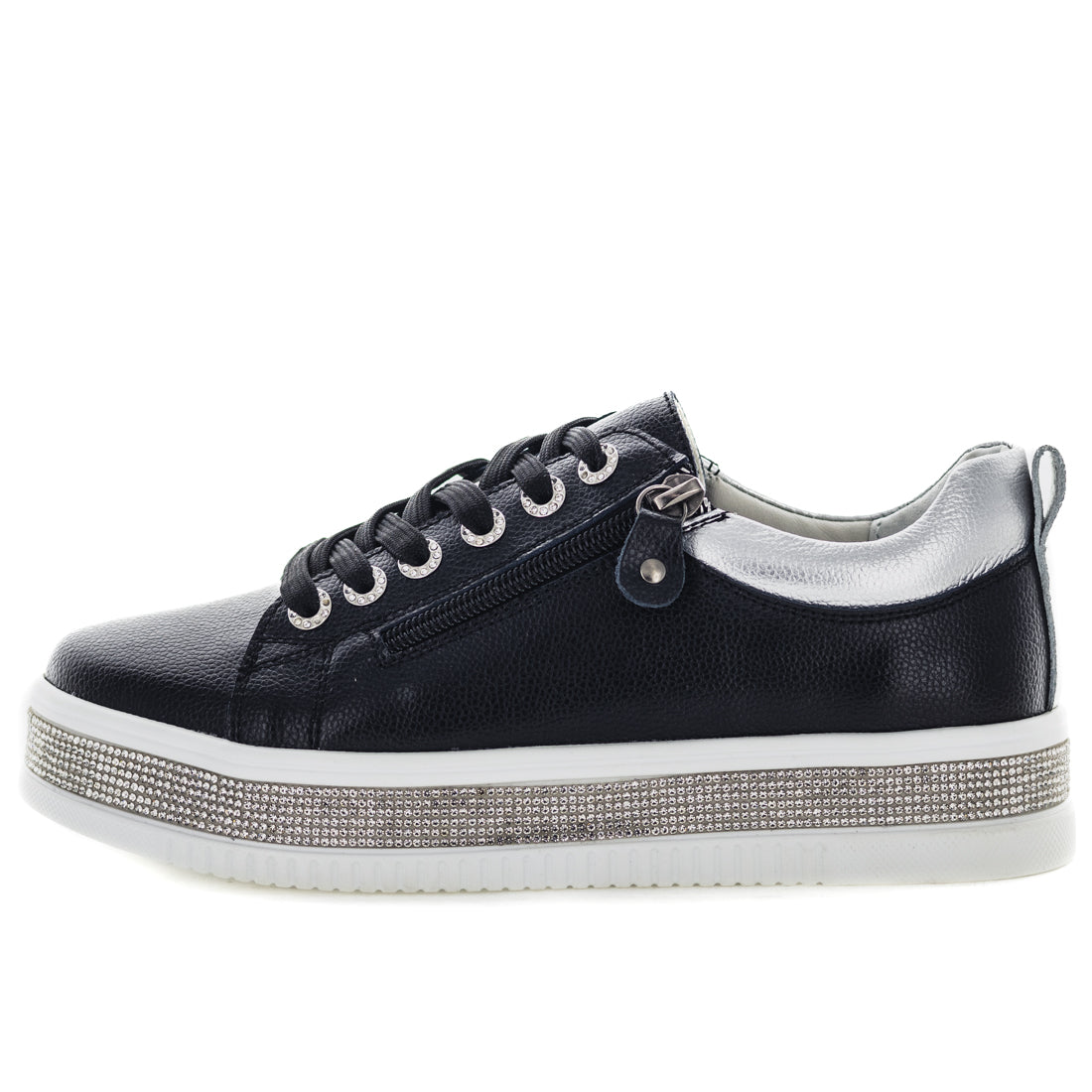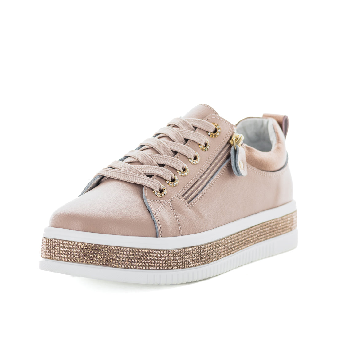 The Cindy Sneakers feature a lace-up leather upper accented with glitter eyelets for a refined touch. A side zip enhances convenience for quick wear, complemented by a soft leather and synthetic lining for all-day comfort. The removable insole allows customization, while the durable, flexible sole with glitter trim and a 25mm flatform offers reliable support and subtle style elevation. These sneakers expertly balance functionality with elegant detailing.