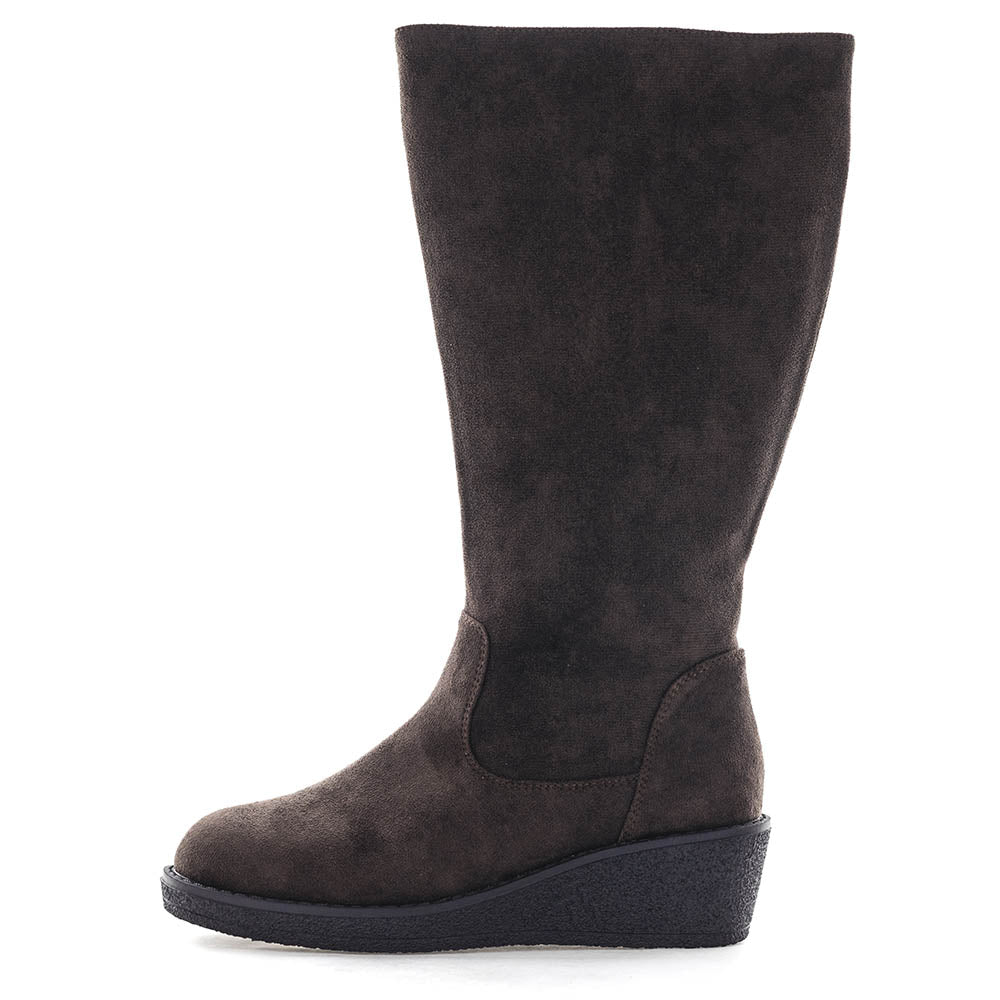 Designed for comfort and style, these calf-length boots feature a convenient inside zip for easy on-and-off wear. The wide calf-fit accommodates fuller calves without compromising on elegance. Built with a durable yet lightweight high wedge heel at 50mm, they provide excellent support and stability throughout the day. A padded comfort insole ensures your feet stay cushioned during extended wear.